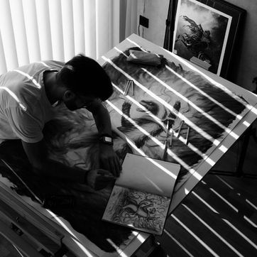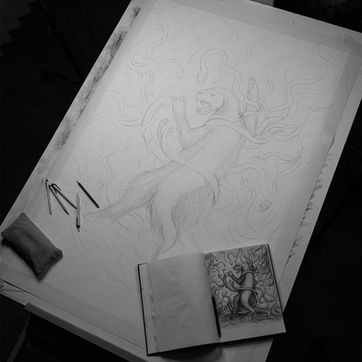 The idea for this artwork emerged long ago, and I’ve been carrying this sketch in my sketchbook ever since. My sketches often come to life spontaneously and take shape quickly. As a result, I have many ideas and sketches waiting to be brought to life—but creating larger, more detailed pieces takes considerable time.