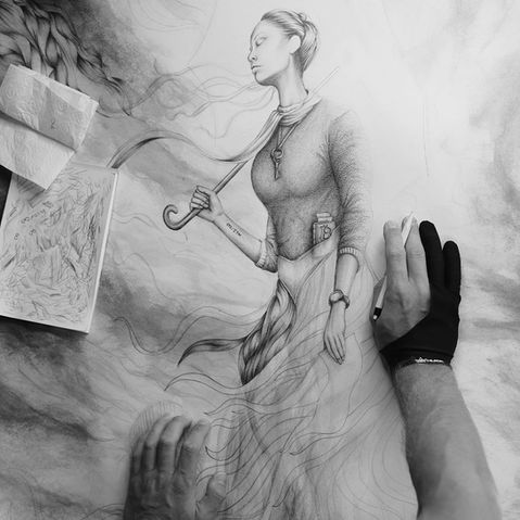 Once the picture had the basic tonality, I started the main work. As it was my first time drawing such a large picture, and only with ballpoint pens, I had to create a new drawing setup.